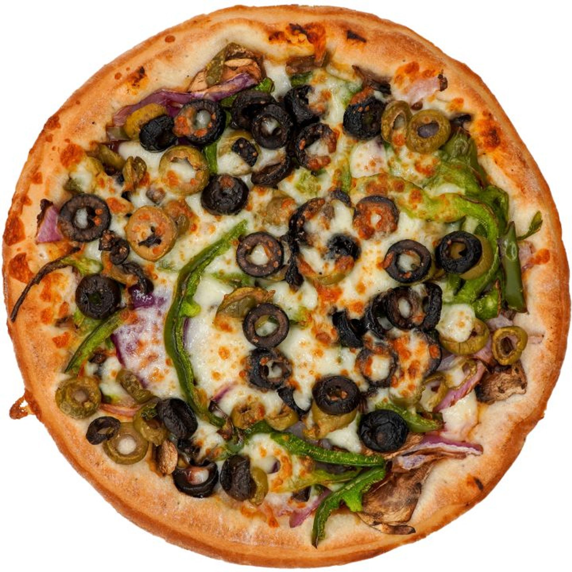 Pizza Crust, Marinara, Mozzarella Cheese, Green Peppers, Red Onions, Mushrooms, and Green and Black Olives.